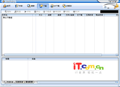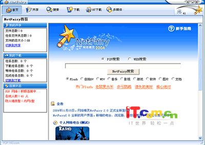 第一眼看到软件主界面就会有种柔和的感觉,现在的软件都非常注重设计,NetFairy在这一点也做的不错。周末应该是上网、娱乐人气最高的时候,而目前的时间是星期天的傍晚,按理说网络上的人气应该非常旺的,但令人失望的是,此时NetFairy在线人数只有40-50人。也许是因为没有大力宣传的作用,我们不管那么多,继续进行我们的火热试用……^_^ NetFairy所有功能可简单分为以下几类:共享、搜索、下载(BT下载)、多媒体。下面就让我们一起来看一下所有的功能如何应用: