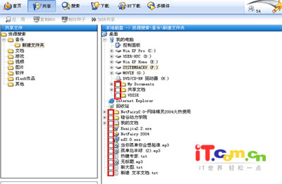 一、把自己电脑中的资源进行共享 P2P软件就是直接进行连接并传输网络上有共享的资源,所以不要那么自私,也把自己的好东西共享一下,供大家下载。要实现共享文件首先点击上方工具栏的“共享”按钮,然后回出现一个如同资源管理器的界面(如图2),把对网友进行共享的文件名前的选项里勾上标记即可。此时,在你联机的状态下,其它的网友搜索资源是时,软件也会将你的共享资源列在搜索对象中了。