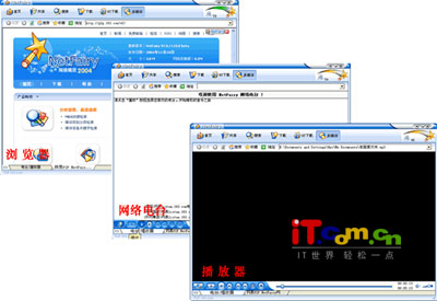 播放器的界面与刚刚推出的WMP 10有些相象处,此功能操作也非常之简单,只许单击“打开文件”按钮即可选择播放文件。当需要播放多首歌曲或者多个视频文件时,点击右边播放列表的“添加”按钮,把需要播放的文件添加到列表中,歌曲或者视频会自动开始播放。选择某一个文件,点击“删除”按钮可以去掉列表中的此一文件。点击“清空”即可把列表中的文件全部清空。选择“保存”则可以保存当前列表,下次直接打开列表即可,不需要重新选择歌曲,这于专业播放软件中的创建播放列表的功能是相似的。