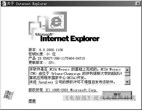 不过用上述两种方法安装的IE6仍有缺陷:当单击IE6帮助菜单上的“关于Internet Explorer”时,显示的密钥长度为0位(图2)。