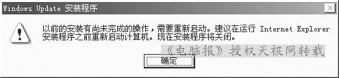 下载了IE6.0安装包解压缩后,双击IE6SETUP.EXE文件进行安装,却得到一个错误提示:“以前的安装有尚未完成的操作,需要重新启动。建议在运行Internet Explorer安装程序之前重新启动计算机。现在安装程序将关闭”(图1)。