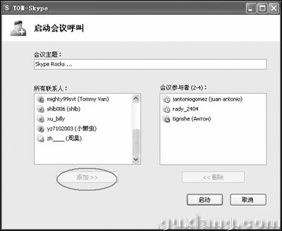 图2 启动会议呼叫 另外,软件还支持PC2Phone的功能,利用它可以拨打普通电话,不但价格低廉而且音效很好,特别适合于经常使用国际长途电话的朋友,不过需要用国际信用卡到Skype网站去购买SkypeOut点数,才能拨打电话。