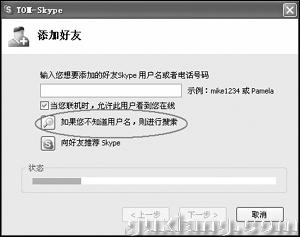 现在,大多数即时通讯软件都提供了音频服务,但是其效果却不能让人恭维,而TOM-Skype采用了先进的P2P技术,能够提供超清晰的语音通话效果,而且呼叫成功率非常高,还可以实现多方通话,甚至能拨打普通电话,这些特点都是一般的聊天工具所无法媲美的。下面我们一起来体会一下它的强大功能。 一、注册并添加好友 第一次启动TOM-Skype时,就会弹出注册账户的窗口,按照注册向导的提示进行填写即可完成注册过程。使用刚刚注册成功的用户名和对应的密码就可以登录软件了,第一次使用TOM-Skype,首先要添加好友。 在主界面中,点击“工具”菜单下的“添加好友”,就会弹出添加好友的对话框(如图1),输入好友的用户名,然后点击“下一步”,按提示操作即可完成添加好友操作。
