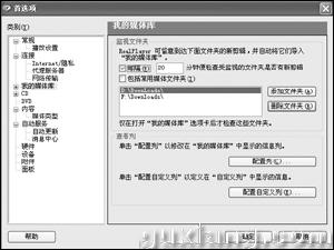 然后在弹出的对话框中点击“添加”按钮,来选择你要监视的文件夹,一次可以添加多个受监视的多媒体文件夹,还可以把FlashGet中保存下载文件的文件夹设置为受监视的文件夹,这样下载的多媒体文件就可以自动加入媒体库了。 编辑提示:在“媒体库”标签下还可以设置一下多媒体文件的大小限制,这样就可以删除一些系统中的声音文件了,如音频设置最小为500KB,视频最小为2000KB。 2. 在RealPlayer中设置 在RealPlayer中也可以自动加入多媒体文件到“媒体库”,点击菜单“工具→首选项”,在弹出的“首选项”对话框中点击左面的“我的媒体库”,接着把右面 “每隔20分钟便检查受监视的文件夹是否有新剪辑”前面的复选框选中,再设置一下间隔的时间,然后点击下面的“添加文件夹”按钮就可以来选择要监视的多媒体文件夹,一次可以添加多个受监视的文件夹。这样每当我们打开RealPlayer中的“我的媒体库”时,软件就会自动检查设置的文件夹,把新的多媒体文件夹添加到“媒体库”中,如图2所示。