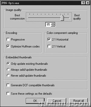 我们在制作网页或VCD电子相册时,要处理大量的图片,其中一个重要的工作就是要压缩图片的体积。这是因为苗条的身材有利于网络的传输,相对于电子相册,体积小巧可以加快制作的速度,过大的分辨率在VCD上播放时也没有什么实际意义。 很多的图像处理软件都提供了图片压缩功能,但相比较而言,采用ACDSee,速度更快,操作也更为简便。 打开ACDSee,打开图片所在的文件夹,在窗口的右面出现文件夹内所有的图像文件。由于图片的来源、格式、分辨率不同,我们可以先为文件按大小进行一下排序,以便选择需要压缩的图片,单击“大小(Resize Images)”按钮,图片文件即按“大小”进行了排列。 本例中我们将图片体积大于1MB的进行压缩,按住Shift键,选中要压缩的所有文件,单击“工具(Tools)→转换(Convert File Format…)”,弹出“格式转换(Convert File Format)”对话框。既然是要压缩图片,当然要选择其中体积最小巧的JPG格式(如图1),单击“格式设置(Format settings…)”按钮,在JPG选项对话框进行一下设置(如图2),您可以调动滑块在“最佳压缩(Best compression)”、“最佳质量(Best qyality)”之间选择图像的压缩率,至于数值就要根据您的实际需要和经验选择了,尽量做到质量和体积兼顾。勾选“渐进”和“优化Huffman码”,在“平滑”微调对话框中输入平滑值,最后单击“确定”。回到“格式设置”对话框,选择图片压缩后输出的文件夹,您可以单击“浏览”选择目标文件夹。需要提醒大家的是,此时尽量不要覆盖原有图像文件,以便在操作有所失误时重新设置。