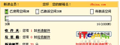 相信读者已经发现,新用户注册新浪免费邮箱时,获得的是30M已激活空间和970M隐含空间,共1000M(如图1.3)。也就是想要得到1G空间是有代价的,那就是用邮票积分获得邮箱空间。