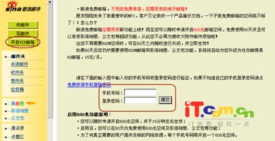 首先,点击左侧的“开启VIP邮箱”,就会进入到手机注册界面(如图1.2),然后输入手机号码,随后手机会收到一串登陆密码,再填写后并提交,这样你的邮箱就会扩容到600M,并可以免费使用60天。