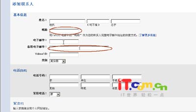 小提示:地址簿中联系人的添加十分详细,甚至可以作为你的联系人的小档案(如图2.6),其中昵称的设置更是方便收件人的填写。除此以外,备用邮件的设置也可以保证信件及时传给收件人。