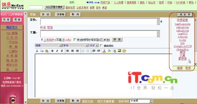 想给谁发信,鼠标点一下就可以了。网易的邮件编辑也分成纯文本和多媒体两种,多媒体编辑界面的一排工具使用起来是非常方便的(如图3.6)。