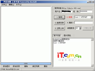 首先填写你网易通行证的用户名和密码,按“登陆”按钮,在下方的提示窗口可以看到相关信息。登陆成功后,软件会自动列出你相册中已经建立的文件夹,在“目录”中可以选取。接下来就可以上传照片了,如果你要上传单张图片的话,点击菜单栏上的“文件—添加图片”,选择你要上传的图片,(图2)在描述栏里面写入你对这张照片的描述,线程数目推荐使用默认的10线程就可以了,然后点击“立即上传”按钮就开始上传了。上传完毕会弹出一个对话框提示你上传成功。