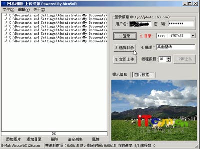 论坛上看到好玩的图片,是否想要和网友们分享呢?旅游归来拍了风景留念照片,是否想要和你的朋友们分享呢?用QQ和MSN传送的话虽然方便,但是要双方都在线才行。如果你想把照片展示给多个朋友的话,这种方法就显得非常麻烦了。还好,现在不少网站都推出了网络相册,将你的照片上传到相册中去,朋友们只要访问你的相册就能看到你的照片了。 网易是国内比较早推出网络相册的网站,现在经过升级后,不但仍然免费,而且没有空间的限制,想放多少照片就放多少。下面先简单介绍一个网易相册。 网易相册的简介 网易相册的地址是http://photo.163.com,如果你拥有网易通行证的话,那么马上可以使用相册。如果没有的话可以注册一个,注册过程和电子邮箱注册过程差不多,按照网页中的提示即可,总共也只有三个步骤,在此就不赘述了。它采用1000M带宽接入,访问速度比较快,而且不限容量,无论你想上传多少照片都可以,但是对单个文件仍然有限制,每张图片的大小只能为2.5M,上传包含图片的ZIP压缩包文件的话,大小限制为5M。每次操作只能上传一个文件,如果你有很多照片的话,要重复N次同样的操作步骤,浪费时间。而且由于使用IE上传,只能单线程,不能发挥你宽带的最大速度。现在Aicosoft开发出一款名叫“网易相册上传专家”的软件,支持多线程上传,还支持文件夹上传,只要将你要上传的照片文件放在一个文件夹内,软件会自动帮你一张一张上传,大大方便图片的上传。 软件简介 软件名称:网易相册上传专家 软件大小: 328K 软件版本: V0.5(免费软件) 特点简介: 网易网络相册的管理软件,支持多线程上传,支持文件夹上传。 软件使用 “网易相册上传专家”是一款绿色软件,不需要安装,双击程序文件即可运行。(图1)