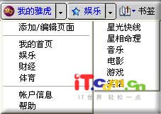 二、功能介绍、使用 搜索工具条最终要的功能当然就是搜索,Yahoo!Toolbar一直采用多重方式进行搜索,输入关键词之后,如果需要按照详细分类来进行内容搜索,可以点击“搜索”右边的小箭头进行相应频道的搜索。 对此工具条大概看一下,娱乐功能的栏目相对较多,显然Yahoo!与OCLC推出的Toolbar是针对雅虎用户娱乐方面的,只要注册雅虎ID,既可使用所有的娱乐栏目。 在工具条中有一个分隔符,其左边的功能则为搜索、工具条设置功能,而右边的则为工具条中的“工具”。此工具条的栏目相对比较丰富,点击第一个“雅虎”图标,则会出现一个下拉菜单,这是一个比较综合的功能,其中包括雅虎首页、电邮、短信、社区、资讯等常用页面快捷方式(如图2)。