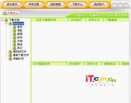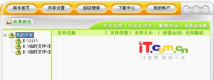 三、共享设置 P2P软件最大的特点就是“人人为我,我为人人”的共享精神,所以在下载其它人东西的时候,我们一定要设置自己的共享文件或是文件夹。点击软件主界面右上方的“共享设置”按钮,在下面的软件操作区就可以看到共享设置的文件或是文件夹了(如图6所示),