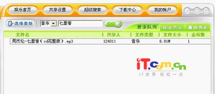二、搜索下载 Sougood是一款免费的P2P软件,所以每一台电脑都可以作为一个服务器,那我们怎样在海量的资源中找到自己想要的信息呢,我们就要用到Sougood的搜索功能了,通过超级搜索可以从互联网上得到音乐、影视、游戏、图片、文档等各类资源。点击软件主界面右上方的“超级搜索”按钮,在出现的搜索框中输入想要搜索的文件名或是关键字,然后点击“GO按钮”就可以搜到想要的信息了。如果我们需要下载周杰伦的《七里香》这首歌,只要在搜索界面上选择“音乐”然后在搜索框中输入“七里香”,点击“GO按钮”后就可以找到搜索结果了(如图5所示)。