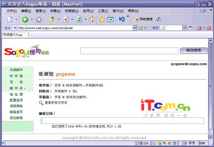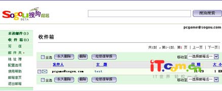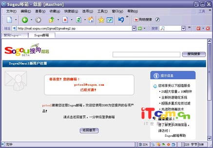 从google推出Gmail后,国内各大门户网站也纷纷对其免费邮箱进行扩容,展开了新一轮的邮箱大战,几百兆的邮箱随处可见,1G的邮箱也数见不鲜,最近sohu旗下的sogou推出了2G的免费邮箱,其具有2G的邮箱空间,同时可以上传10M的附件,同时具有出色的多重垃圾邮件过滤及先进的防病毒功能。下面就让我们一起来领略一下这款2G邮箱的风采吧。 一、注册 首先我们看一下sogou 2G邮箱的注册,在地址栏输入其网址:http://www.sogou.com/,点击其页面上的“搜狗Gmail邮箱”(如图1所示),在弹出的注册窗口中输入你要注册的ID号(因刚刚推出,所以大家快来抢注自己喜欢的ID吧),然后点击注册,接着在下面的窗口中输入密码等必要信息,点击确定后就弹出注册成功窗口了(如图2所示),这样一分钟后就可以进入邮箱了。