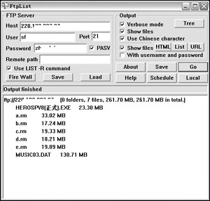 现在,很多站点或是个人都架设了FTP服务器,利用它向朋友或是网友提供文件下载服务。而朋友们在下载FTP服务器上的文件时,有的采用浏览器直接下载,有的则使用专用的FTP客户端软件进行下载,这些下载方式都有一个共同的弊端,那就是在使用这些下载方式下载前,都必须成功登录服务器后,再在“资源大海”中捞那根自己想要的“针”,不仅费时,更费力。 FtpList这款软件就可以帮助你达到“未下先知”的境界,让你事先浏览目标FTP服务器上所有的文件目录情况,迅速找到自己想要的文件,而且它还可以直接将这些文件目录情况导出为HTML格式的文件,你可以直接点击文件中的链接而进行快速地下载。下面我们就来看看它的使用方法: 首先,从http://www.onlinedown.net/soft/22572.htm将软件下载到本地,解压后直接双击程序即可运行,如图所示。 在“Host”框中输入FTP服务器IP地址,如果FTP服务器不支持匿名登录,请在“User”框中输入登录用户名,在“Password”框中输入登录密码,如果该FTP服务器使用的不是21端口,请在“Port”框中输入该FTP服务器使用的端口号,另外,如果你很清楚FTP服务器上的目录结构的话,而此时你只想知道某个目录中的文件情况,只要在“Remote path”框中输入该目录结构。设置完毕后单击“Go”,程序就开始探测服务器了。 接下来就是选择导出FTP服务器上的文件列表的方式:有HTML风格、列表风格、还有只显示URL,根据你的需要进行选择,例如我们选择HTML格式,单击“HMTL”按钮,再选择文件保存的位置即可,导出完毕后你就可以用浏览器直接打开该HTML格式的网页,此时你可以直接点击其中的链接并启用下载就可以了。 除了可以列出FTP服务器上的文件目录,它还可以列出本地某个文件夹中的文件情况,只要单击“Local”按钮并选择要列出目录的文件夹,“确定”后即可。 这个小巧的绿色软件,它的作用却异常强大。对于那些FTP一族来说,它绝对是一个好帮手。而那些FTP站点管理员也可以用它来适时查看服务器上的文件情况,另外,它的新版本中将会添加计划任务功能,届时,我们可以让它按我们的计划做更多的事情,让我们拭目以待吧!