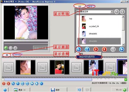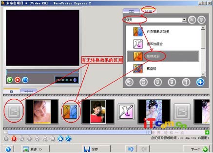 对于添加进来的图片和音乐素材会自动添加到下方的项目窗口中,此时我们可以直接在项目窗口中删除一些不需要的图片,也可以从素材窗口中直接选中图片拖放到项目窗口,如果要改变图片的播放先后顺序,同样直接拖动即可改变。 添加完图片之后,同理再添加背景音乐素材,添加的项目将会显示在下方项目区域的“显示音频”选项卡中。 ②转换效果 将右上方的素材区域切换到“显示转换”选项卡,然后从下拉菜单中选择转换的类别,同时拖动具体的转换效果到下方的项目素材之间的两个图片之间,添加好转换效果的项目之间就会显示具体的转换效果示意图,而没有添加的则是灰色显示(图13)。