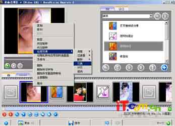 小提示:双击添加的图片、转换效果可以打开其属性窗口,在属性窗口中可以设置图片和效果显示的时间。 如果你对素材的效果不是很满意,此时可以直接在下方的项目中选中要修改的图片并右击,在弹出的菜单中选择“应用效果”,然后在其子菜单中对图片进行相应的编辑修改(图14)。