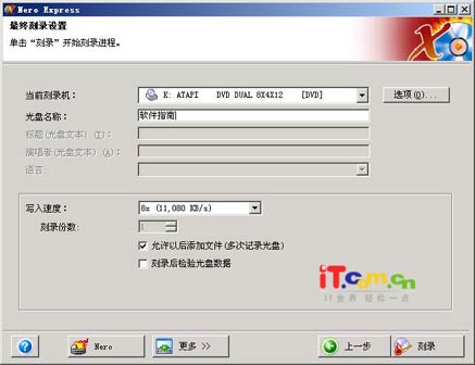 返回光盘内容窗口,在窗口的底部会显示出目前已经添加的文件大小,如果不需要添加其它文件,那么只需要单击“下一步”进入最终刻录设置窗口,首先选择好使用的刻录机,然后再为制作的数据光盘选一个有个性的名称并设置写入速度。在这里要提醒大家的是如果我们的光盘空间一次没有全部用完,那么一定要选择“允许以后添加文件(多次记录光盘)”选项,做好这些设置之后就可以单击“刻录”按钮进行等待了(图5)。