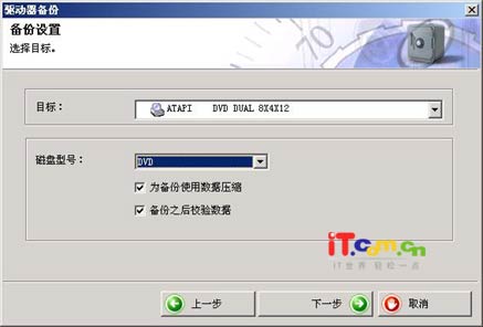 打开备份的目标设置对话框,其目标自然选择DVD刻录光驱了,对于磁盘型号则应该为“DVD”,为了节约空间以及降低错误,建议读者同时应选中“为备份使用数据压缩”和“备份之后校验数据”两项,当然这会使备份的时间延长(图9)。