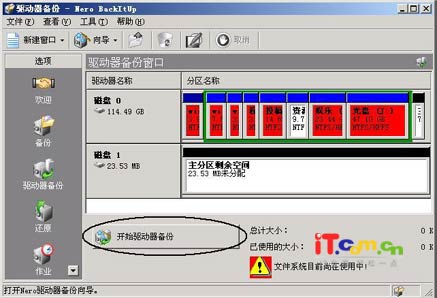 ⑶系统备份光盘 说起系统备份,大家一定不会陌生。在以前的Windows 98年代,使用一张CD一般就能备份完整个系统。但是到了Windows 2000/XP,系统占用的空间大了,要装的软件多了,一不留神其容量就超“G”了,多的可能达到两三个G,再使用普通的CD显然很麻烦。不要紧,我们可以使用DVD来制作系统备份,这样就不用担心容量的问题了。 依次选择“开始—程序—Nero—Nero 6 Ultra Edition—Nero backItUp”打开备份操作欢迎窗口,单击软件主界面左侧“选项”区域的“备份驱动器”项,这样在主区域将显示所有分区,单击选中要进行备份的分区,然后单击“开始驱动器备份”按钮(图8),
