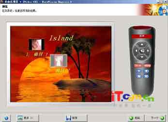 ④预览效果 做好菜单设置之后单击“下一个”按钮进入预览窗口,预览窗口的左侧就是我们将DVD碟片在DVD播放机中播放的真实效果,而右侧则是模拟的遥控器(图17,如果需要修改的话只需要单击“返回”按钮进行调整。