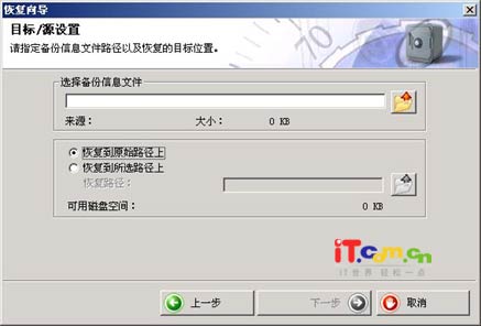 有备份就有还原,在这里的还原有两种情况,当我们的系统还能启动时,那么只需要进入系统,启动Nero backItUp后在左侧选择“还原”项,在随后的窗口中单击“开始恢复”按钮启动恢复向导,单击向导的“下一步”然后设置恢复的源文件,并选择“恢复到原始路径上”(当然我们也可以根据需要恢复到指定位置)(图10),然后单击“下一步”根据提示进行操作就可以了。