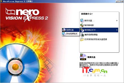 ⑷DVD相册 扫描仪、DC已经是大家很常见的装备了,将照片刻录成DVD相册光盘,在影碟机上播放那将是一件多么开心的事!既然如此,我们就利用Nero的同门兄弟NeroVision Express来制作DVD相册光盘吧。 因为在一张DVD光盘中可以存放数百张高质量的照片,进行分组播放管理一个很好的解决方案。因此在制作DVD相册之前提醒大家将图片按类别存放。 依次点击“开始—程序—Nero—NeroVision Express 2—NeroVision Express”打开软件,在主界面上依次单击“制作新幻灯片—视频光盘”进入DVD相册制作主界面(图11)。