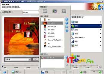 ③创建菜单 在默认情况下程序提供的菜单模板比较少,我们可以到其主页上下载更多的菜单模板,不过在这里我们暂且先使用程序提供的模板。在左上方“选择菜单模板”下拉菜单中选中,然后我们观察到在右侧有一个“你想要修改什么”提示,在下面有“配置”、“背景”等多项,只要我们单击相应的项目,就会弹出一个大的选择窗口,在其弹出的窗口中就可以选择具体项目的修改。例如我们要修改菜单的背景,那么只需要单击“背景”按钮,就可以从刚刚添加的图片中选择一幅作为背景,如果不满意这些图片还可以单击“浏览画面”按钮选择其它图片(图16)。