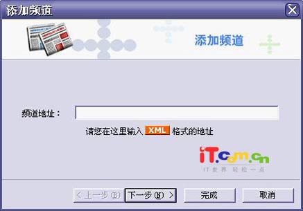二、添加新的频道 上面我们简单的介绍了一下软件的主界面,前面我们说了,软件不但可以浏览新浪网站的RSS频道,同时还可以浏览其它网站的RSS内容,只要你知道其XML地址就可以了。如何能够知道其XML地址呢,一般直接RSS内容的网站,都会在其页面上有一个XML的标识,只要右键点击XML标识选择“复制快捷方式”,然后点击常用工具栏上的“添加频道”,在弹出的“添加频道”窗口的频道地址文本框中点击右键选择“粘贴”就可以了(如图4所示),