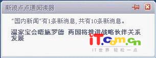 从图上可以清楚的看到,软件安装完成后,就自动加载了新浪新闻中心、体育、娱乐、汽车与读书五个RSS频道组。同时可以看出软件的主体结构与Outlook差不多,软件主界面分为“两栏三区”,两栏分别是“菜单栏”与“常用工具栏”,在这里我们可以对新浪点点通阅读器进行一系列的设置,让它更加方便我们的阅读,三区分别是频道列表区、标题区及内容区,频道列表区中可以看到添加到软件中的频道组及频道,标题区中列出的是某个频道中的标题、发布时间及作者名,而在下面的内容区中就可以看到点击某个标题后的内容了,这也是我们查看新闻的主要区域了。另外软件的三个区边界可以隐藏与自由调节区域大小,这样就便与我们阅读新闻了。 另外在打开软件后,我们还可以看到会对各个频道自动更新,同时在桌面的右下角出现更新提示(如图3所示),这样我们的电脑只要能上网,我们定制的新闻就可以随时更新,使你不会错过关心的新闻内容了。