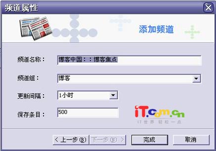 点击“下一步”,软件会检测这个地址是否支持RSS,如果支持就会出现“频道属性”对话框(如图5所示),在这里可以更改频道的名称、更改频道所属的频道组以及频道更新间隔时间与保存该频道的条目数量。