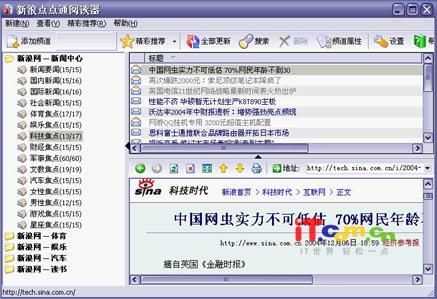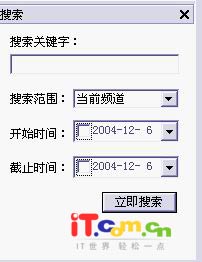 添加新的频道比较简单,同时频道添加后会自动更新其内容。下面我们重点介绍一下新浪点点通的另一个特长功能,那就是读书频道。我们刚刚说了,添加频道后以后就不用打开网站也可以查看其相关的内容,这里的内容不仅包括文字新闻、图片新闻、短讯等,其中也可以是“书”,这里的书不只是指新书的新闻,同时也可以是书的直接内容,我们可以直接把某本你喜欢的书的内容地址直接添加进阅读器中,这样就可以在阅读器中直接阅读你的图书了,同时图书在更新的时候会阅读器会自动更新(连载文章),这样你就不用再去查看内容是否更新了,只要打开阅读器就可以了。怎么样?使用阅读器看书就不用再翻箱倒柜,也不用下载保存了,只要用鼠标轻轻的点击就可以了。这的确是喜欢读书人的一个福音呀。 三、新闻的阅读 上面我们频加了新的频道后,接下来就是阅读新闻了,其实聪明的读者早就看出来了吧。其实新闻的阅读非常方便,只要点击相要查看的频道组,选中相应的频道,同时再点击标题栏里的标题就可以了,这时就可以在下面的内容区里看到相应的新闻内容了。另外在标题区与内容区之间我们可以看到一个工具栏,在工具栏上有前进、后退、打印、全屏等快捷图标,通过这些快捷图标,我们可以方便的阅读其新闻内容,甚至可以把内容打印保存。 如果以前看过的新闻,再次查看却忘记了新闻标题,这时只要点击常用工具栏上的“搜索”图标,就会在软件的左下角出现一个搜索窗口(如图6所示),在这里输入要搜索的关键字,选择搜索所属的频道及文章更新时间,点击“立即搜索”后就可以看到相应的新闻了。