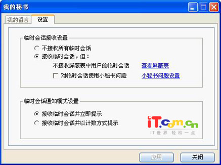 在这里来访的客人可以把想要交流的内容告诉“小秘书”(在消息框中输入要说的话),如果你的QQ正好在线, “小秘书”就会把内容传达给你了。当然了,一些不速之客小秘书也会拒之门外的,这时只要点击“拒绝”,就可以把他加为黑名单。为防止他人的长期骚扰,也可以点击“设置”(或是QQ面板上的小秘书图标),为小秘书增加提问功能(如图4),只有当客人回答正确小秘书的问题后,小秘书才会进行接待。
