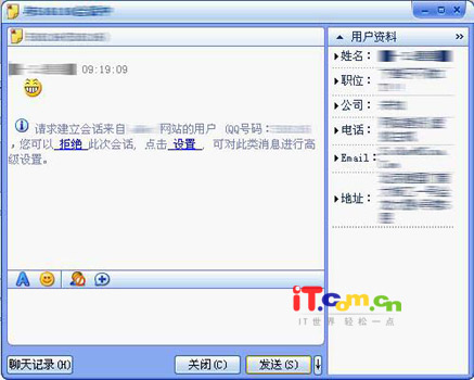 如果有客人来访时,只要点击“秘书”图标(图2上生成的图片按钮),你的“小秘书”就会彬彬有礼的进行“接待”工作了(弹出临时会话窗口如图3)。