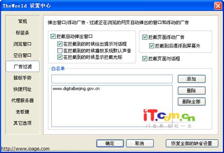 单击主窗口菜单中的“选项→TheWorld 选项”,选择“广告过滤”项,设定“拦截自动弹出广告”的方式(如图1)。如果你不想禁用某个网站的弹出广告窗口,可以将该网站地址添加到“白名单”中。然后,单击主窗口中的“工具”菜单,分别勾选“弹出窗口广告拦截”、“页面浮动广告拦截”项,如果将“安全[安静]浏览”选中,则可以避免ActiveX窗口。