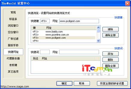 单击“选项→TheWorld 选项”,在弹出的“TheWorld 设置中心”对话框中选择“快捷网址”项,选择一个快捷键(如图2所示,只能是从F1 到F12这些功能键,可惜不能自行设置),然后在“网址”后面的框中输入利用该快捷键打开的网站地址即可。除了使用快捷键打开网站外,还可以使用快捷词,设置方法很简单,在“快捷词”处定义即可。