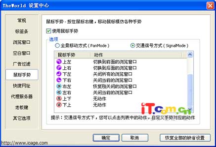 五、鼠标手势全面控制 用过Maxthon的朋友都知道,其鼠标手势操作能给我们上网带来很大程度上的便利。TheWorld 浏览器也同样具有此项贴心功能,只是默认情况下并没有打开。只要单击“选项→TheWorld 选项”主菜单然后选中“鼠标手势”项,勾选“使用鼠标手势”框并在下面选择“交通信号方式”即可(如图5)。点击列表中的项目可以对每种手势对应的动作进行设置,以适应自己的浏览习惯。