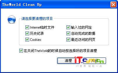 四、冲浪无痕悄无声息 在TheWorld 浏览器中,我们可以方便地管理网页访问历史记录。单击“工具→清理上网记录”菜单,就能轻松清除“Internet 临时文件”、“输入过的网址”、“历史记录”及“自动完成的数据”等项目,具体方法是选择相应项后点击“清理”按钮。如果你想在每次浏览完网页并关闭TheWorld 浏览器时自动清理相关项,只须先选择项目再勾选“在关闭TheWorld 的时候自动按选择好的项目清理”即可(如图4)。