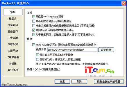 同样在“TheWorld 设置中心”对话框中切换到“常规”项,选择“当按下ALT键的同时鼠标点击页面元素的时候快速保存”复选框,默认的保存路径为TheWorld 文件夹下的picfolder子目录,如不满意可以点击后面的“设定目录”按钮自行设置(如图3)。如果希望保存的图片或Flash自动分类,可选择“保存时按网页域名创建子目录”项。值得注意的是,如果在按下Alt键的同时点击网页标签,则将自动保存网页到MHT文件。