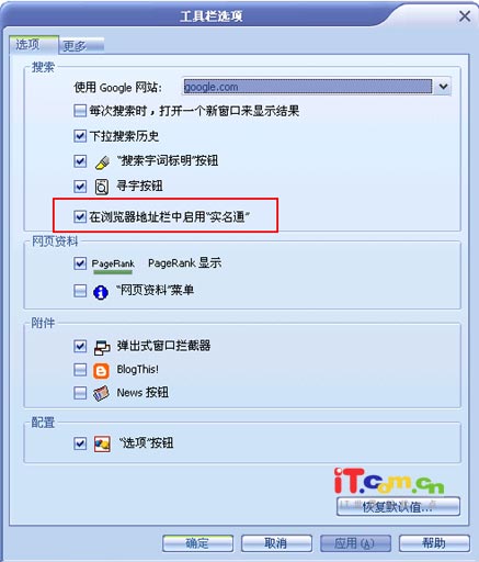 点击工具条上的“选项”按钮,然后在弹出的“工具栏选项”窗口中选择“在浏览器中地址栏中启动实名通”(如图2所示),最后点击确定。