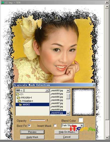 第三步:选好后会弹出一个设置对话框,在中间选择具体的相框式样,然后在下面可以设置一下背景颜色等参数,完成后点击“Apply Mask”按钮就可以了。(图2)