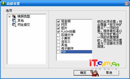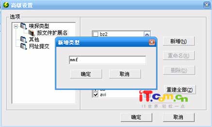 获取在线电影的地址比较简单,点击在线电影网站的某部电影后,影音嗅探器会自动探测到电影的下载地址,并且显示在软件的地址列表栏中,点选该地址,再点击文件菜单上的“列表”,就可以指定用Flashget或NetTransport来下载了。(需要安装这两个软件)当然你也可以复制该地址,使用其它任何支持流媒体下载的软件来下载。笔者查阅了官方网站的资料,上面说如果用Flashgetv1.65版本下载的话,很多电影不能连续观看,而且这些电影文件大多也不能修复,推荐大家使用NetTransport下载电影。 手机铃声的下载方法和在线电影的下载方法基本一致,不过软件默认只能探测到mid格式的手机铃声的地址,现在手机铃声的格式大多为mmf格式,软件不能自动探测,需要手动添加。点击文件菜单中的“设置—高级设置”,然后点击“嗅探类型”前面的加号,选择“按文件扩展名”,再按一下右边的“新增”按钮,在新增类型窗口中输入mmf,按“确定”就可以增加mmf格式文件的嗅探了。(图3)