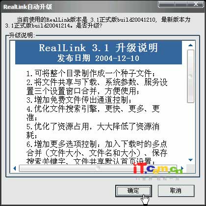 安装时会出现安装选项,其中包含视频和音频插件的安装,如果你已经安装过诸如FFdshow或MPC之类的插件包,那么就不用安装RealLink自带的插件了。其他安装步骤只需一路按“下一步”即可。首次运行时RealLink时软件会自动检测升级,如果有新版本的话会弹出对话框提示你升级,点击“是”下载最新版本并自动安装,升级安装完毕后就会运行了。(图1)