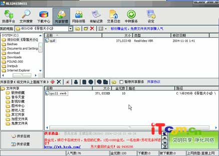 “下载中心”可以对正在下载的文件进行操作,还可以打开RealLink种子进行下载,种子将在后面进行详细介绍。 “共享管理”界面中可以设置要共享的文件,在上方的本地资源管理界面中选择你要共享的文件,拖动到下面的共享窗口中就完成共享了。然后鼠标右键点击下方的共享文件,设定价格或者生成一个种子文件,这个种子的概念和BT种子的概念比较相似,别人只要用RealLink打开种子就可以下载你共享的文件了。(图7)