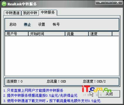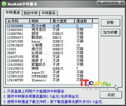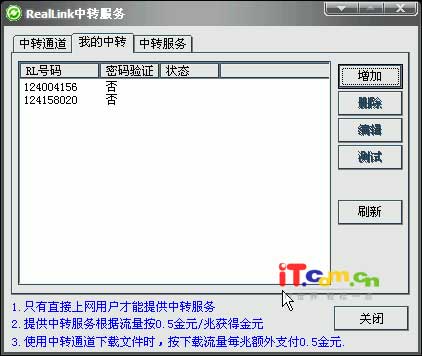 “中转服务”是RealLink的一个特色功能,如果你拥有外网IP(ADSL拨号或有线通上网)的话,那么你可以做为一个通道为两个局域网的RealLink用户传递文件,不但方便了别人,你也可以从中获得金元作为报酬。点击“中转服务”选项卡,在点击“启动”按钮,你就成为了一条临时通道了,如果别人选择了你这条通道的话,那么就可以获取金元了,当然,这会消耗你的带宽。点击“我的中转”选项卡,可以为两个特定的RealLink用户建立一条临时通道,并且可以设置密码,防止别人占有这条通道。如果你是局域网用户,需要下载另一个局域网用户的文件,那么点击“中转通道”选项卡,选取一条速度快点的通道就可以了。(图8 图9 图10)