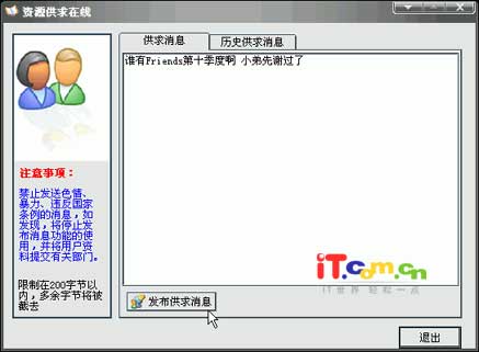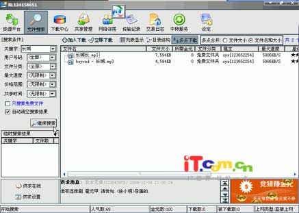 “文件搜索”提供了一个搜索引擎,你可以搜索其他RealLink用户共享的文件,设置合适的搜索条件可以更准确的找出你想要的内容。搜索前勾选“只搜索免费文件”,那么就会搜索你要寻找的内容中提供免费下载的结果。选择一个结果,点击鼠标右键,点击“立即下载”就可以开始下载了。如果你要找的东西没有人共享的话,你可以点击左下角的“供求设置”,输入你的需求信息(你也可以发布广告,宣传你的共享信息来赚取金元),来寻求其他人的帮助。供求信息会在旁边的信息栏中发布。当然,发布需求信息也是需要金元的。(图5 图6)