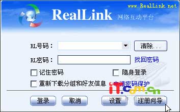 RealLink和QQ类似,需要申请一个RL号码才能使用,点击“注册向导”申请号码,申请步骤只需按照软件提示即可,再次就不赘述了。申请完毕后填入RL号码和密码即可登陆。(图2)
