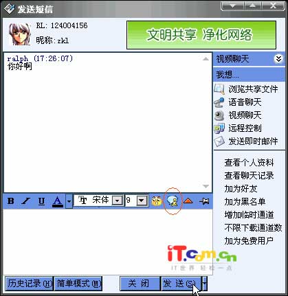 RealLink的聊天方式和QQ基本类似,同样也拥有语音视频聊天和即时邮件功能,操作方式和QQ也基本相同,快捷键也兼容,熟悉QQ的朋友使用起来应该很快就能上手,要注意的是邮件只能发送给在线用户。点击图中框出的小人图标,还可以实现截图和播放背景音乐的功能。如果是付费用户的话,还可以使用远程控制功能,不过笔者不是付费用户,没有使用过,不知道功能怎样,是否能穿透防火墙,如果有读者用户用过的话,希望能和我交流一下。(图4)