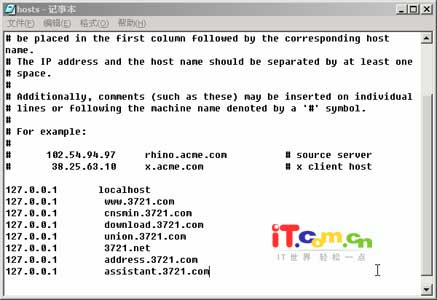 里面只做了一个映射,将localhost映射到127.0.0.1,也就是本机的IP地址。前面有#号的是说明,不起作用的。现在我们要做的事情,就是将这些插件和广告的网址映射到本机IP地址,这样就不会出现弹出窗口了。 屏蔽插件 首先去除3721的安装插件的提示对话框,将3721的网址都映射为127.0.0.1。 如果你已经安装了3721网络实名,先卸载掉。然后再hosts文件中输入以下内容: 127.0.0.1 www.3721.com 127.0.0.1 cnsmin.3721.com 127.0.0.1 download.3721.com 127.0.0.1 union.3721.com 127.0.0.1 3721.net 127.0.0.1 address.3721.com 127.0.0.1 assistant.3721.com 这里要注意,IP地址输入完毕,至少输入一个空格后再输入网址,空格多一点没有关系。还有,每行只能输入一个IP地址和网址。格式看下图。